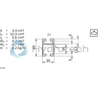 The Bosch Rexroth PROFILE RAIL 30X45C L=6170MM (3842558312) is a high-quality aluminum profile rail designed for versatile applications. This anodized aluminum rail is specifically engineered to facilitate the movable mounting of parts, making it ideal for use as a screwdriver hanger at workstations or for EcoSafe sliding doors. The profile rail comes with an end piece that serves as a cover cap with a built-in stop, providing added safety and functionality. It also includes a trolley system featuring dustproof ball bearings that ensure smooth and reliable sliding motion. The trolley is equipped with a ring suitable for suspending items like spring hooks, enhancing its utility in various setups. The profile rail and trolley system are designed to accommodate fastening profiles with an 8 mm slot, offering ease of installation and secure attachment. Delivered as a single rod in standard length, this profile rail boasts impressive structural properties, including a moment of resistance in the y-direction (Wy), area moment of inertia in both y-direction (ly) and x-direction (lx), as well as a moment of resistance in the x-direction (Wx). Its mass (m) and length (L) specifications ensure that it meets the demands of robust industrial applications. The product's material composition contributes to its lightweight yet durable characteristics, with a weight specification provided for reference. For optimal use, Bosch Rexroth recommends accessories such as end pieces available in signal gray or black and additional trolleys for the profile rail xC. This PROFILE RAIL 30X45C L=6170MM is part of Productgroup ID A and comes in specified packaging units, ready to be integrated into various systems requiring high-quality linear motion solutions.
